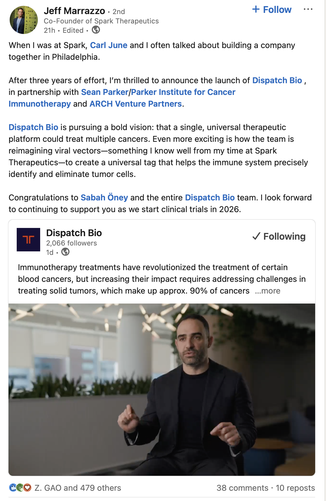 Dispatch的管理团队也相当豪华, Spark Therapeutics的联合创始人Jeff Marrazzo做公司主席, ARCH请出了他们Venture Partner Sabah Oney做CEO,在ARCH他帮助孵化了多家biotech。