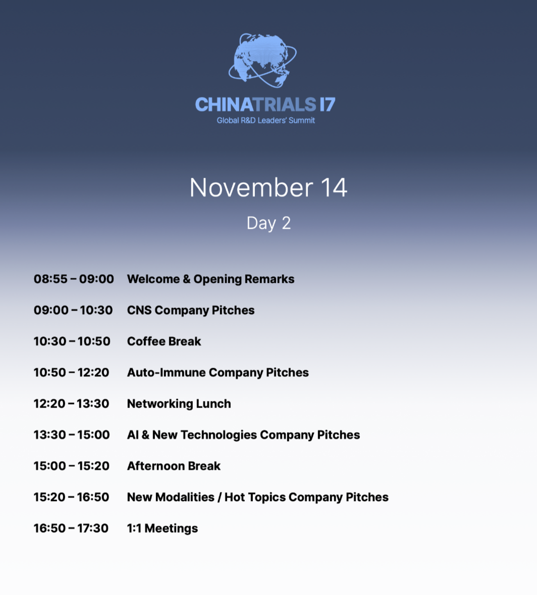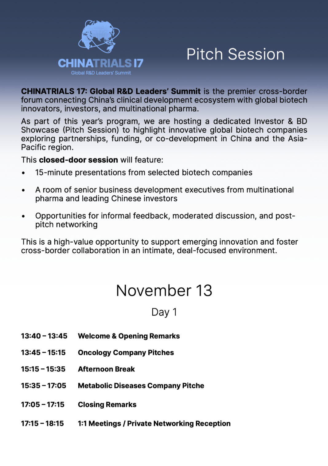 作为本次年度会议的重要组成部分,我们将在11月13日-14日专门为投资者与商务拓展(BD)从业者举办一场闭门路演交流会,重点推介那些有意在中国大陆及亚太地区寻求合作、融资或联合研发机会的创新型生物技术企业,路演招募范围覆盖中国、日本、韩国、新加坡和澳大利亚等国家。