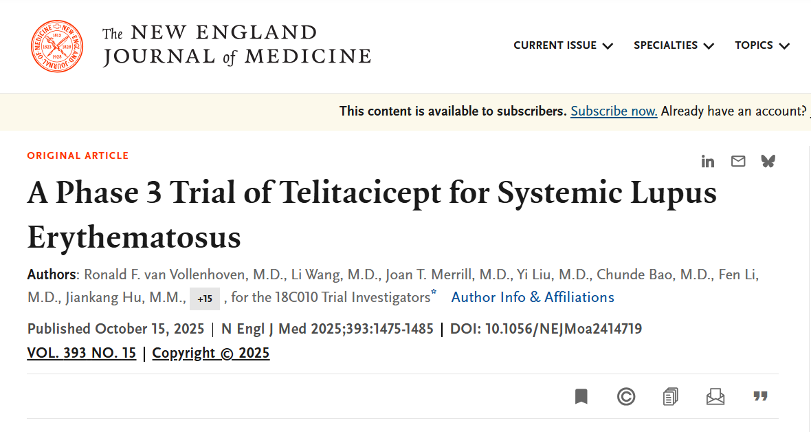 10月16日,荣昌生物宣布,泰它西普治疗系统性红斑狼疮(SLE)的中国Ⅲ期临床研究成果,重磅发表于国际顶级医学期刊《新英格兰医学杂志》(NEJM)。