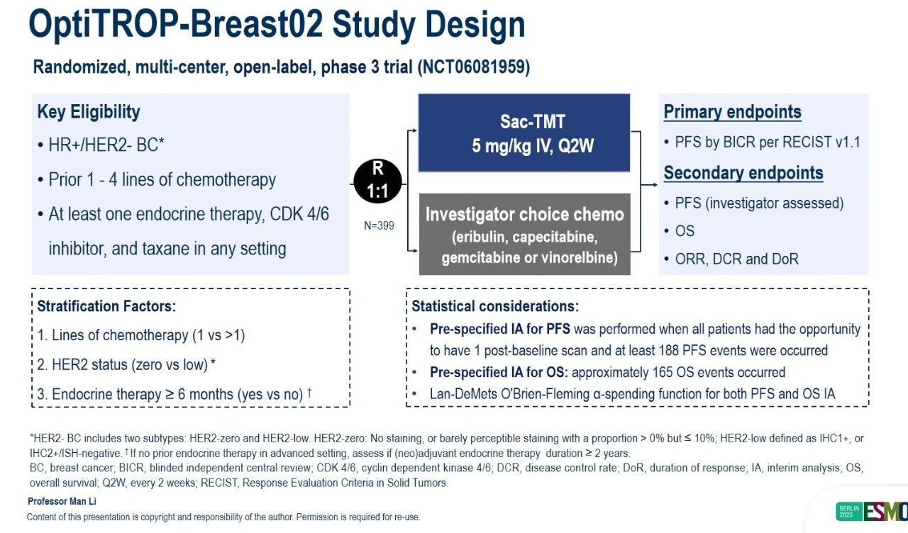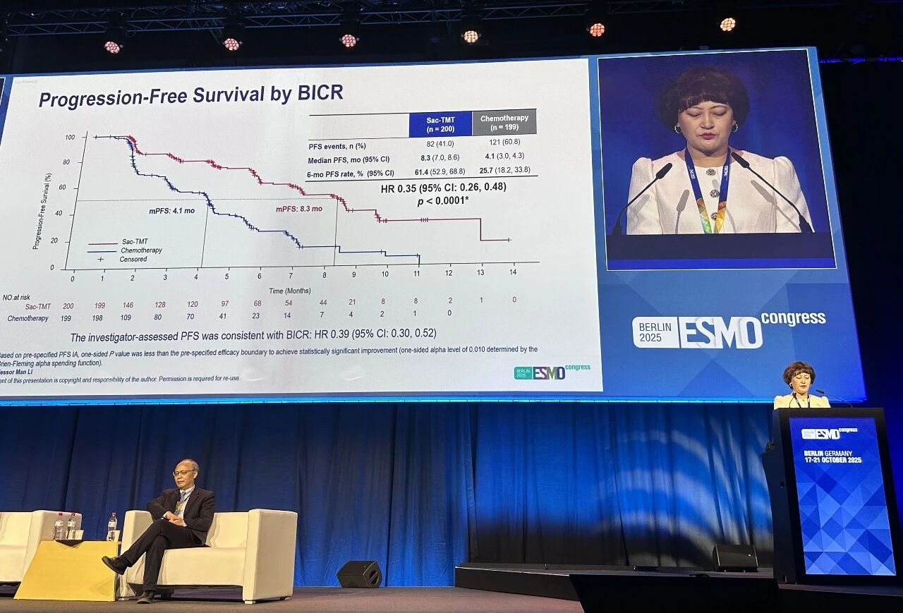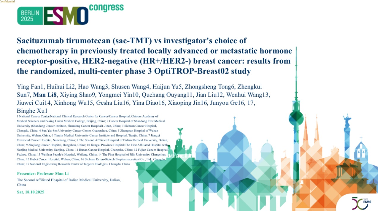 2025年10月18日,四川科伦博泰生物医药股份有限公司(下称“科伦博泰”或“公司”,6990.HK)宣布,在德国柏林举行的2025年欧洲肿瘤内科学会(ESMO)年会上,大连医科大学第二附属医院李曼教授以口头报告形式公布了靶向人滋养细胞表面抗原2(TROP2)的抗体偶联药物(ADC)芦康沙妥珠单抗(sac-TMT,商品名:佳泰莱®)用于经治局部晚期或转移性激素受体阳性(HR+)人类表皮生长因子受体2阴性(HER2-)乳腺癌(BC)的III期OptiTROP-Breast02研究结果(报告编号:LBA23,优选论文专场1:转移性乳腺癌)。此前,芦康沙妥珠单抗(sac-TMT)用于治疗这一适应症的新增适应症上市申请已获国家药品监督管理局(NMPA)受理,并被纳入优先审评审批程序。