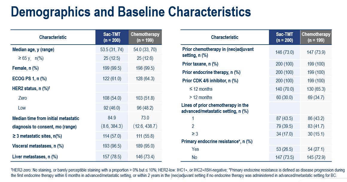 在OptiTROP-Breast02研究中,共有399例既往接受过CDK4/6抑制剂治疗且在晚期或转移性阶段接受过至少一种化疗后进展的HR+/HER2- BC患者,被随机(1:1)分配接受芦康沙妥珠单抗(sac-TMT)或研究者选择的化疗(ICC)治疗。
