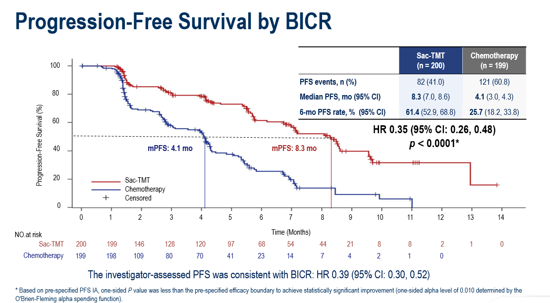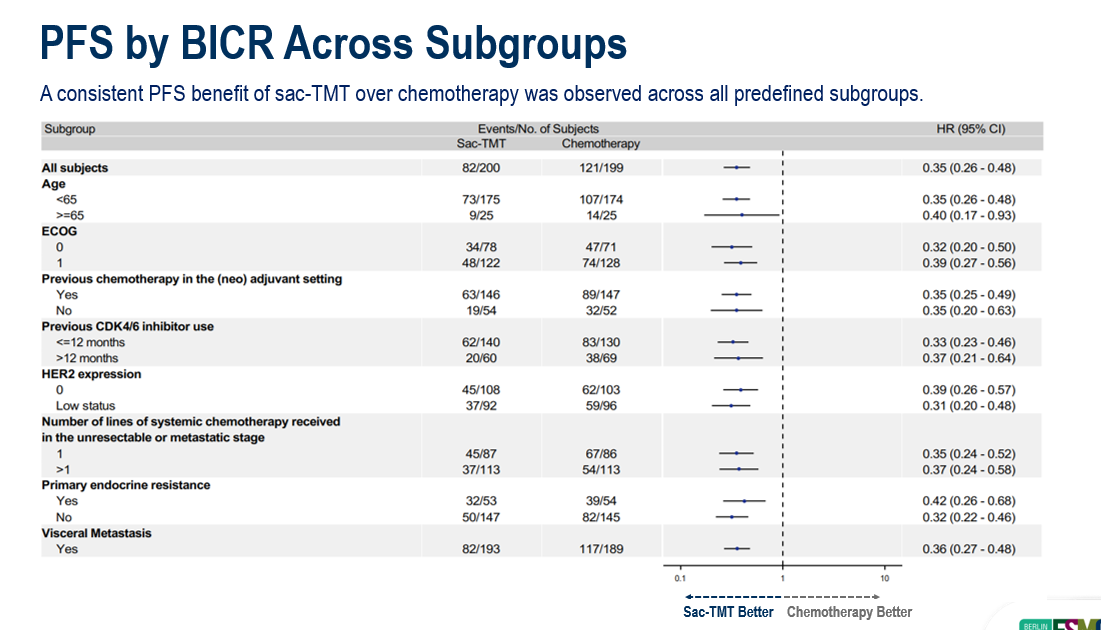 数据截至2025年1月22日,芦康沙妥珠单抗(sac-TMT)组的中位PFS较ICC组有显著延长(8.3个月对比4.1个月;HR, 0.35;95% CI, 0.26-0.48;P<0.0001),且在不同HER2表达水平的患者中均观察到临床获益(PFS的HR:在HER2不表达患者中为0.39, 95% CI, 0.26-0.57;在HER2低表达患者中为0.31, 95% CI, 0.20-0.48)。