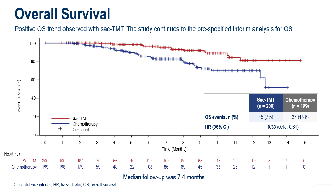 芦康沙妥珠单抗(sac-TMT)组的OS相对ICC组存在更有利的趋势 (HR, 0.33; 95% CI, 0.18-0.61)。