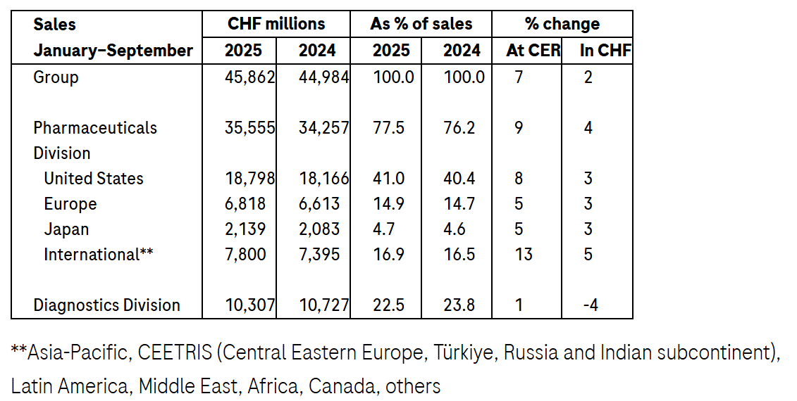 In the first nine months of 2025, Roche achieved sales growth of 7% (2% in CHF) to CHF 45.9 billion due to strong demand for our pharmaceutical and diagnostic products.