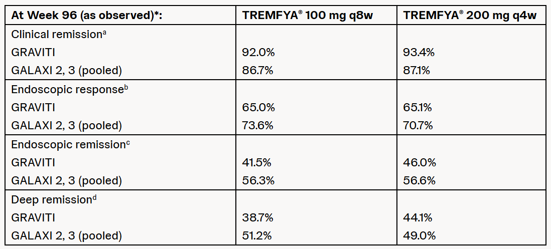 Clinical remission rates were over 85% for both TREMFYA® maintenance doses at 96 weeks in both the Phase 3 GRAVITI and GALAXI studies