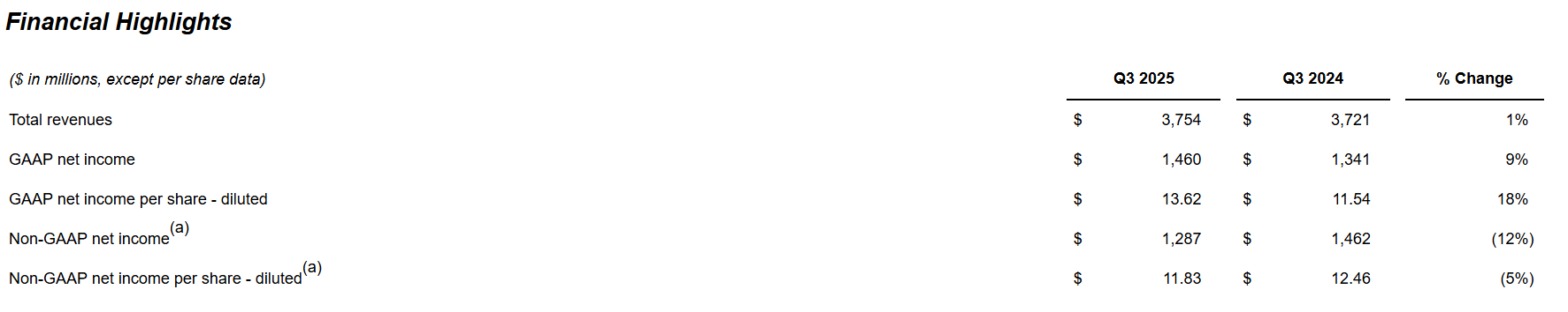 GAAP EPS of $13.62 and non-GAAP EPS(a) of $11.83; third quarter 2025 includes unfavorable $0.68 impact from acquired IPR&D charge