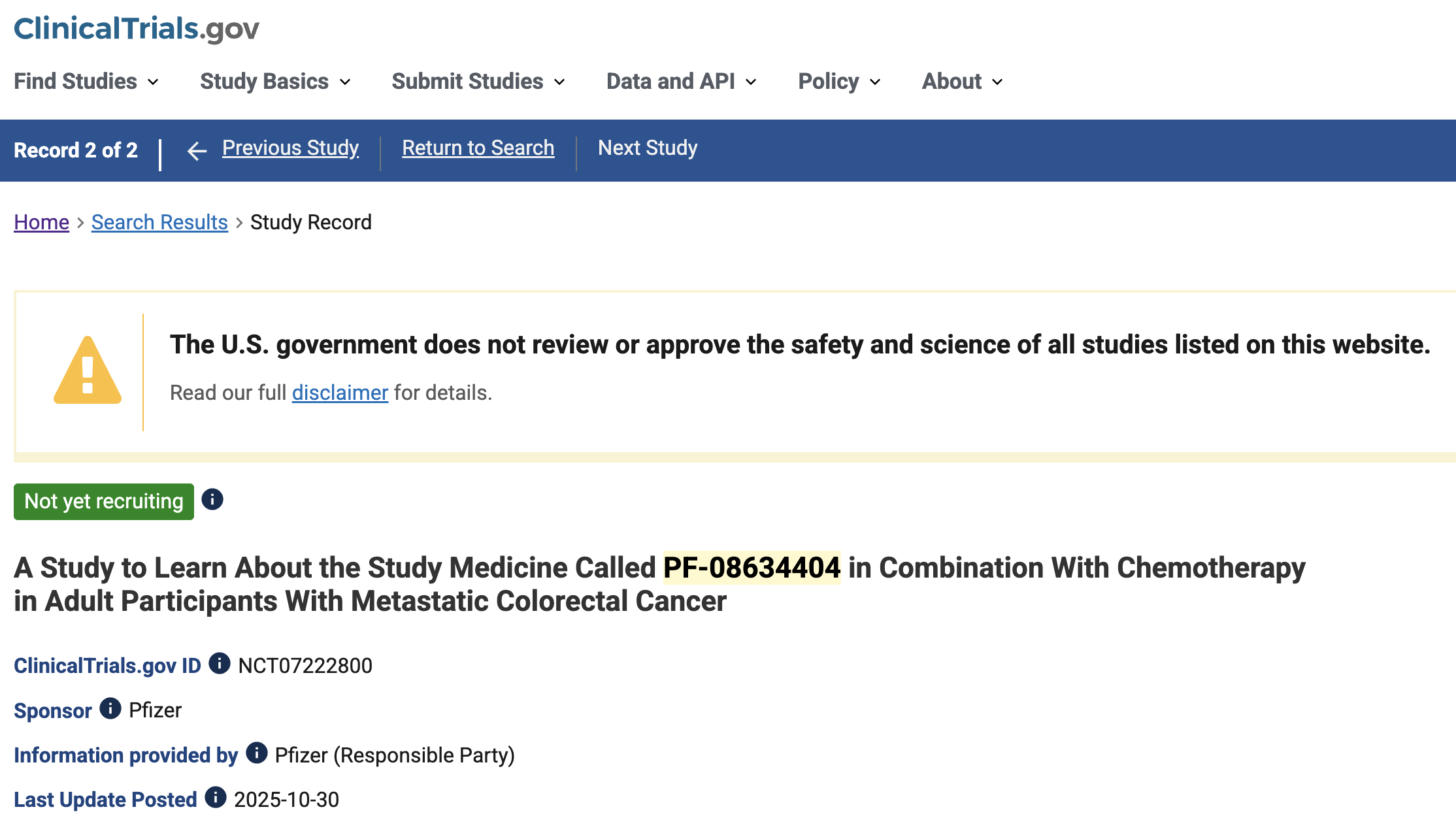 PF-08634404是辉瑞于今年5月斥巨资从三生制药引进的一款PD-1/VEGF双抗。此次辉瑞登记的两项临床研究分别是:针对局部晚期或转移性非小细胞肺癌的III期研究中,PF-08634404联合化疗“头对头”对比当前标准疗法Keytruda联合化疗的疗效与安全性;针对转移性结直肠癌的III期研究中,PF-08634404联合化疗“头对头”对比当前标准疗法贝伐珠单抗联合化疗的疗效与安全性。