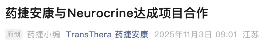 11月3日,药捷安康宣布,与Neurocrine Biosciences达成项目合作,将其NLRP3药物平台中的NLRP3抑制剂在大中华区以外开发、制造及商业化的独家权利授予Neurocrine。
