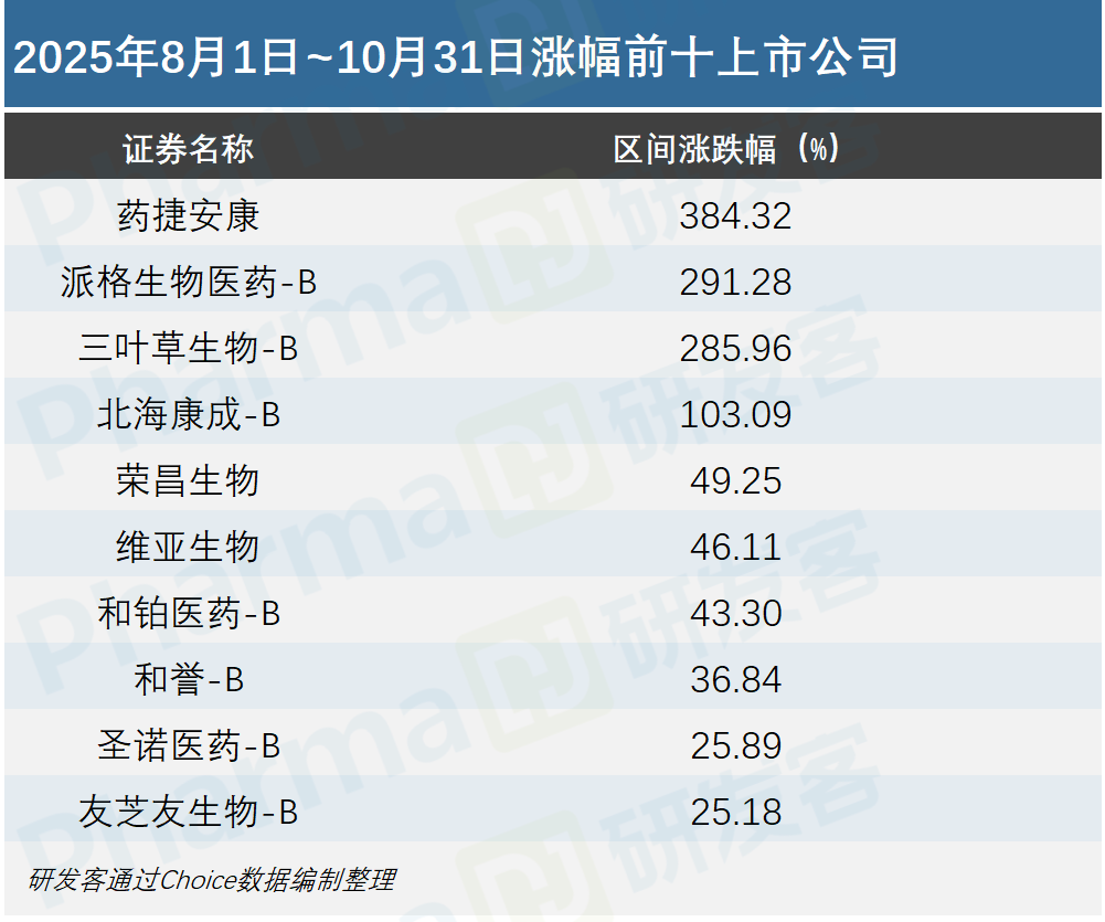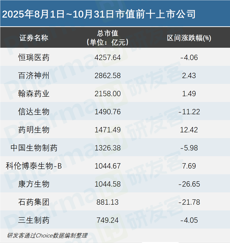 过去三个月(8月1日~10月31日),备受资金关注的创新药板块进入持续调整通道,恒生生物科技指数区间涨幅-7%,中华香港生物科技指数区间涨幅-5.86%。研发客根据Choice数据统计整理可见,56家生物医药公司中,21家公司在过去三个月实现上涨,其余35家公司均出现不同程度下跌。