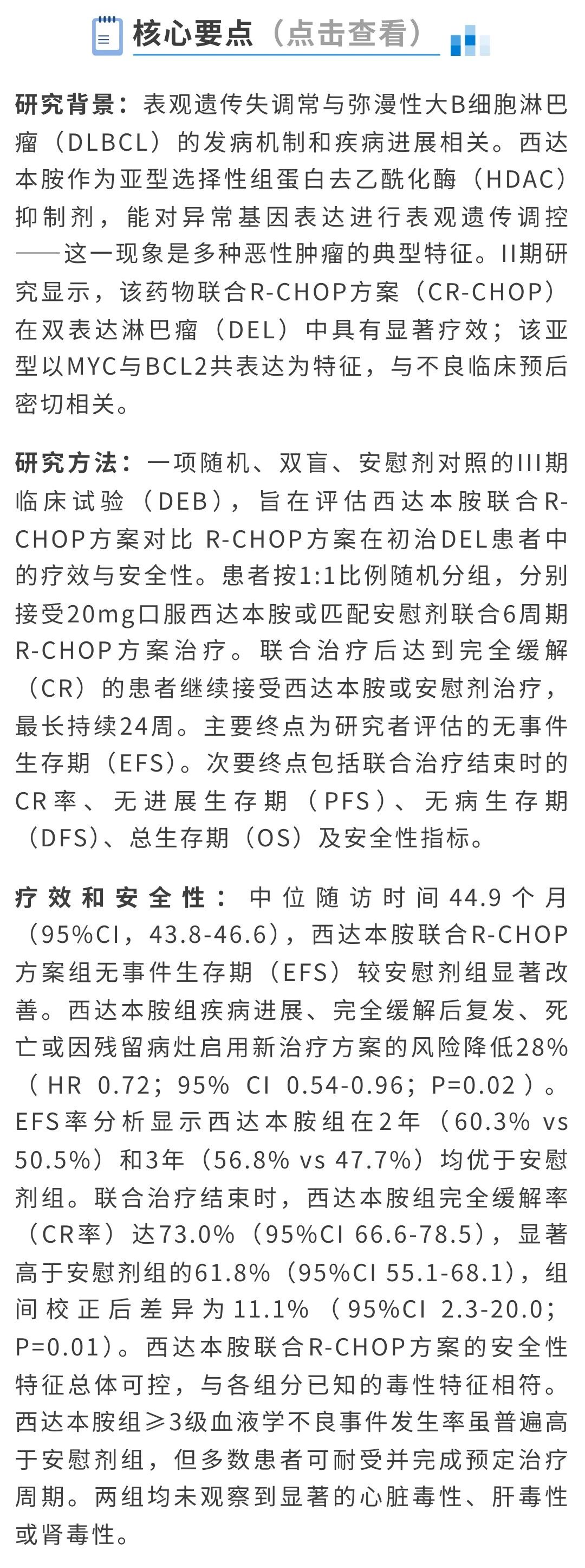 研究名称:西达本胺联合R-CHOP方案治疗未经治疗的MYC/BCL2双表达弥漫性大B细胞淋巴瘤:随机III期DEB研究的主要疗效和安全性结果