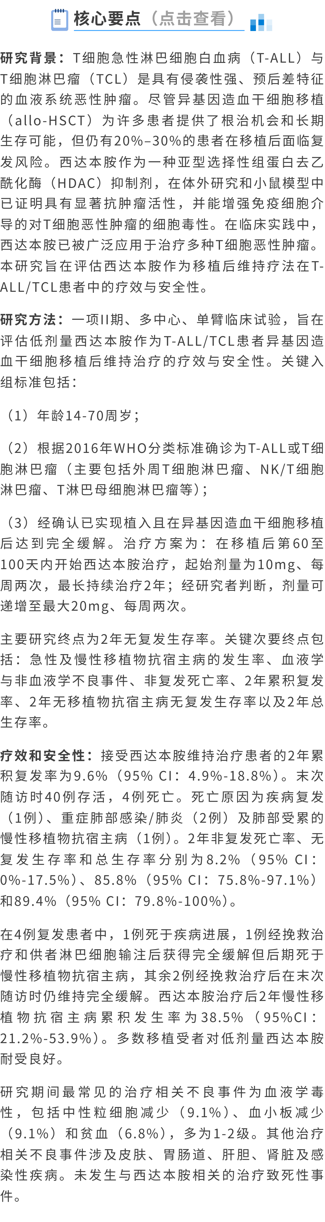 结论:异基因造血干细胞移植后采用低剂量西达本胺维持治疗,在T-ALL/TCL患者中展现出卓越疗效与可控的安全性。该治疗方案可作为T-ALL/TCL患者移植后的合适治疗选择。