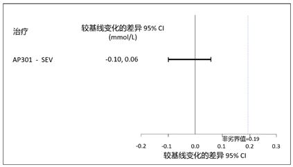 治疗至第 12 周,AP301 在降低血清磷水平方面非劣于碳酸司维拉姆。AP301 相比基线降幅最小二乘均值(LSM)为 0.72 mmol/L (2.22 mg/dL),碳酸司维拉姆降幅为 0.70 mmol/L (2.17 mg/dL),两者 LSM 差异为 -0.02 mmol/L (95% CI: -0.10, 0.06) [-0.06 mg/dL (95% CI: -0.31, 0.20)],其 95% CI 上限为 0.06 mmol/L (0.20 mg/dL),低于预设非劣界值 0.19 mmol/L (0.59 mg/dL)。(见图一)