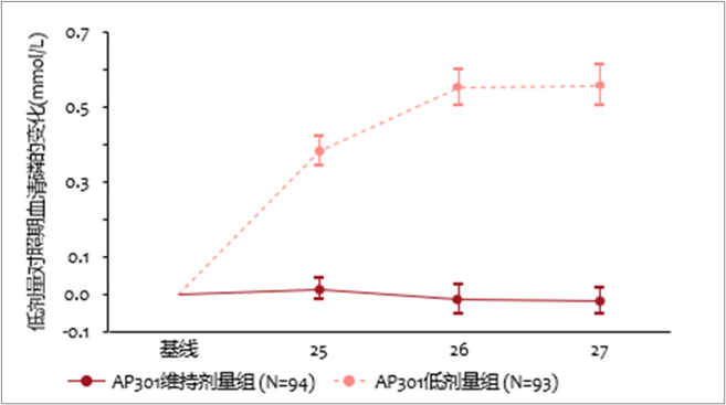 治疗至第 27 周,AP301 维持剂量对比低剂量在降低血清磷水平上显示出具有临床及统计学上的显著优效性 {LSM 差异为 -0.58 mmol/L (95% CI: -0.69, -0.47; P <0.001) [-1.8 mg/dL (95% CI: –2.1, –1.5; P <0.001)]}。(见图二)