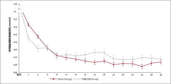 有效性:AP301 维持剂量在降低血清磷水平上,相较于无效低剂量具有临床及统计学上的显著优效性,且在整个 52 周的治疗期内,AP301 的疗效稳健且持久,达到试验设计的降低血清磷水平方面不劣于碳酸司维拉姆的终点。
