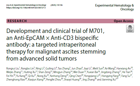《Experimental Hematology & Oncology》(EHO)是血液学与肿瘤学领域的国际高水平期刊,2025年影响因子达13.5,稳居JCR Q1分区,具有重要的学术影响力。此次M701研究成果的发表,也进一步印证了该项目的创新性与临床潜力。