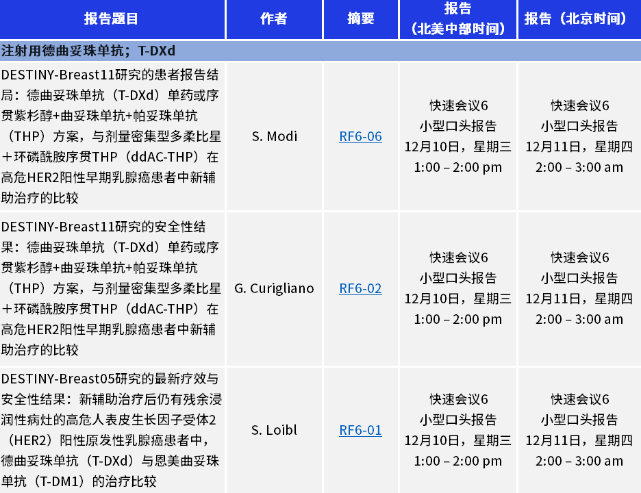 四场快速迷你口头报告将重点展示德曲妥珠单抗在HER2阳性乳腺癌的治愈性阶段和转移性阶段中的数据,其中包括来自DESTINY-Breast11三期试验的两项报告,分别展示在高风险、局部晚期HER2阳性早期乳腺癌患者新辅助治疗(手术前)中,对比德曲妥珠单抗序贯紫杉醇、曲妥珠单抗和帕妥珠单抗(THP)与剂量密集多柔比星和环磷酰胺后联合THP(ddAC-THP)的报告结果(RF6-06)以及进一步安全性数据分析(RF6-02)。此外,还将重点介绍来自DESTINY-Breast05三期试验的额外疗效和安全性数据(RF6-01),该试验比较了德曲妥珠单抗与恩美曲妥珠单抗(T-DM1)作为术后辅助治疗方案,用于新辅助后(术后)乳腺及/或腋窝淋巴结仍存在残余浸润性病灶的高危HER2阳性早期乳腺癌患者。