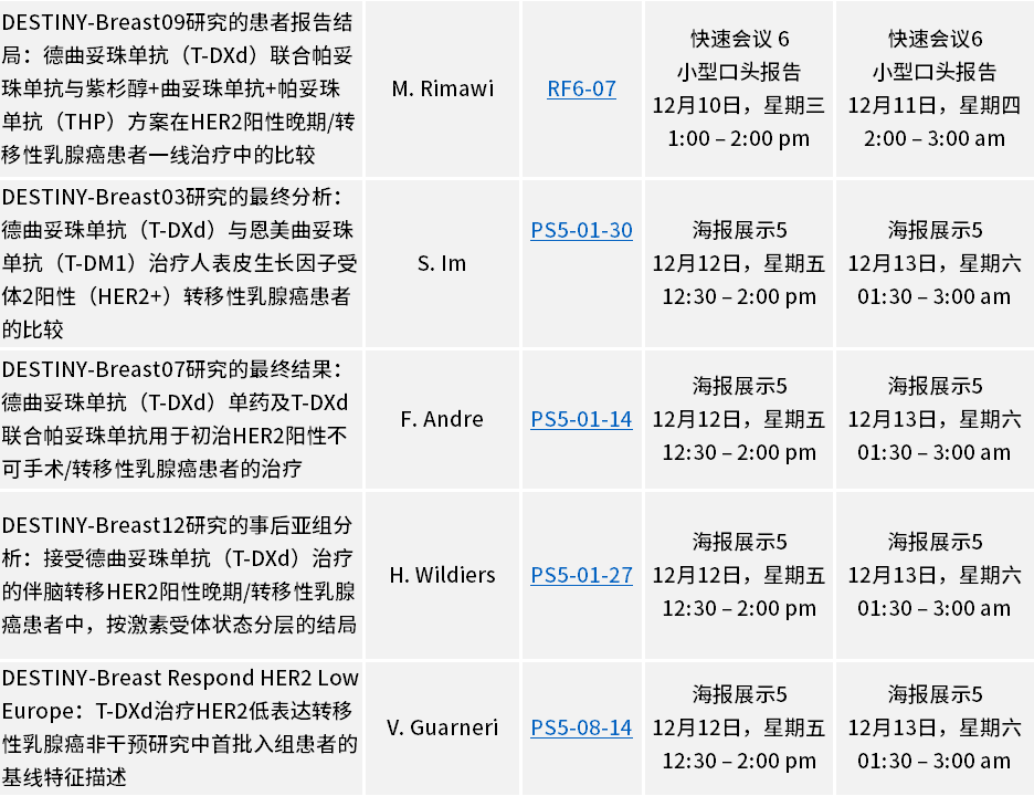第四场快速口头报告将公布 DESTINY-Breast09 Ⅲ期临床试验中德曲妥珠单抗联合帕妥珠单抗治疗组的患者报告结局(RF6-07),评估其作为 HER2 阳性转移性乳腺癌一线治疗的效果。DESTINY-Breast09试验的中期结果近期已发表于《新英格兰医学杂志》,标志着德曲妥珠单抗已有八项关键性研究[1-8]登上这一全球顶级医学期刊。