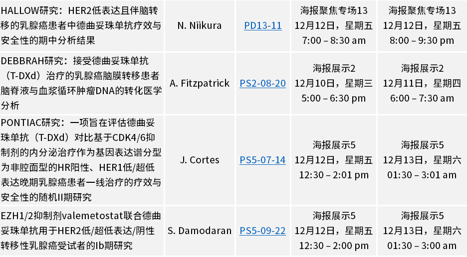 另外两项海报展示将公布德曲妥珠单抗与德达博妥单抗的颅内及/或颅外活性:一项是DEBBRAH II 期试验(PS2-08-20)中德曲妥珠单抗转化医学ctDNA分析结果,评估其在伴脑膜转移的HER2阳性及HER2低表达乳腺癌患者中的颅内和颅外活性;另一项是DATO-BASE II 期试验(PS1-09-02)中德达博妥单抗的颅内活性结果,评估其在伴脑膜转移的HER2阴性乳腺癌患者中的疗效。
