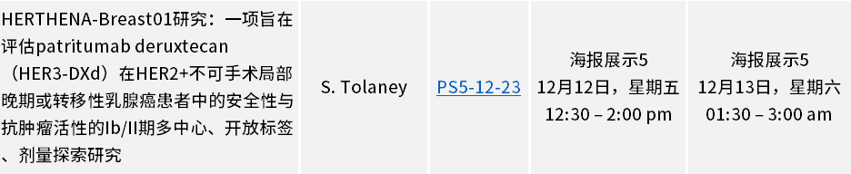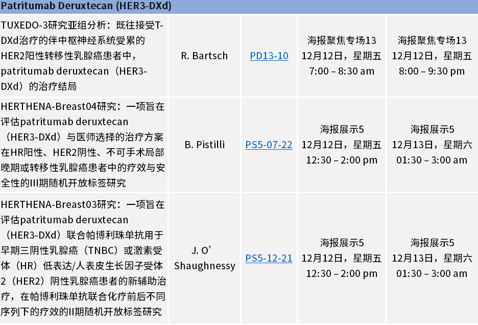 Ptritumab deruxtecan (HER3-DXd) HERTHENA 临床开发项目中三项正在进行的试验也将成为亮点,其中包括:HERTHENA-Breast04 III 期试验(PS5-07-22),评估HER3-DXd与医师选择的治疗方案在HR阳性、HER2阴性不可手术局部晚期或转移性乳腺癌患者中的结果;HERTHENA-Breast03 II 期试验(PS5-12-21),评估HER3-DXd联合帕博利珠单抗用于高危早期三阴性乳腺癌(TNBC)或HR低表达/HER2 阴性乳腺癌患者的新辅助治疗,在帕博利珠单抗联合化疗前后不同序列下的结果;以及 HERTHENA-Breast01 Ib/II 期试验(PS5-12-23),评估HER3-DXd联合HER2靶向药物用于HER2阳性不可手术局部晚期或转移性乳腺癌患者的结果。