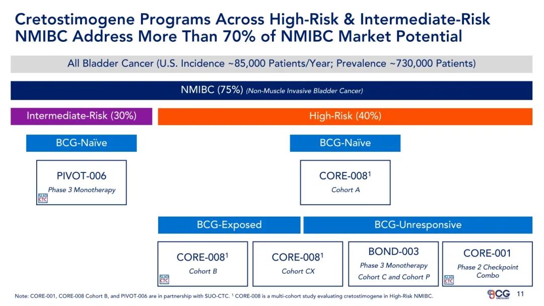 NMIBC 约占膀胱癌人群的 75%,其中中危人群占 30%、高危人群占 40%。此次更新的是Cretostimogene(CG0070)Ⅲ 期临床试验 BOND-003 Cohort P 关键结果数据,以及 CORE-008 Cohort A 首次数据。Cretostimogene(CG0070)针对非肌层浸润性膀胱癌(NMIBC)的中高危核心人群实现了全覆盖布局。