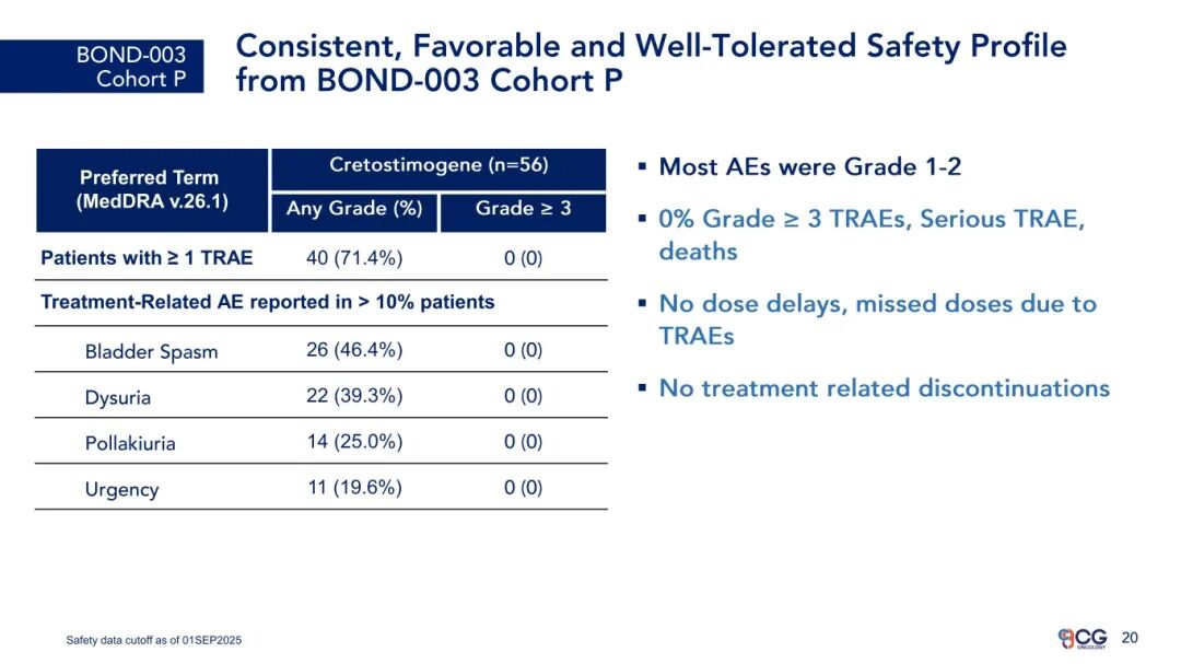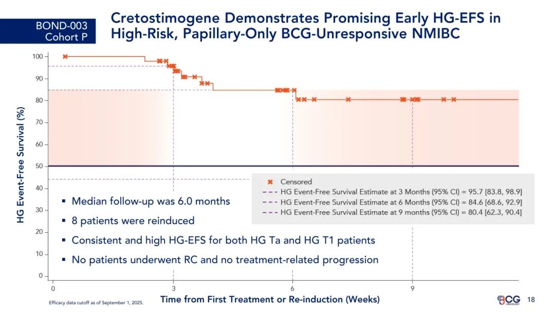 BOND-003 Cohort P 针对BCG无应答(BCG-UR)的乳头状高危NMIBC(Ta/T1 期)患者。截至2025年9月1日,该队列已完成入组,共56例患者在美国、日本的 35 个临床中心接受了治疗;其中51例疗效可评估患者的中位随访时间为 6.0 个月,其3个月、6个月及9个月 HG-EFS 分别达95.7%(95%CI:83.8–98.9%)、84.6%(95%CI:68.6–92.9%)和80.4%(95%CI:62.3–90.4%)。另外,该队列无患者接受根治性膀胱切除术,也未出现治疗相关的疾病进展。
