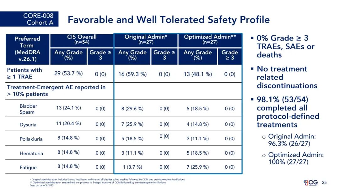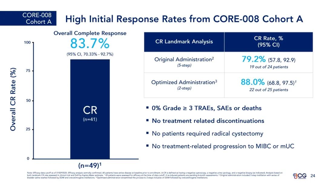 CORE-008 Cohort A针对BCG初治(BCG-Naïve)的高危NMIBC(含原位癌 CIS)患者。截至2025年9月1日,49例可评估患者的任意时间点总体CR率为83.7%(41/49,95% CI:70.3-92.7%),其中原给药方案(5-step)组 24 例患者中有 19 例达到 CR,CR率为79.2%(95% CI:57.8-92.9%);优化给药方案(2-step)组 25 例患者中有22例达到CR,CR率为 88.0%(95% CI:68.8-97.5%)。