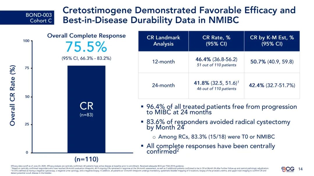 此外,针对高危、卡介苗不响应的伴原位癌(CIS)患者的Cohort C队列中,Cretostimogene(CG0070)仍保持着NMIBC领域历史最佳的持久性疗效数据。主要终点任何时间CR率为75.5%,12个月CR率为50.7%,24个月CR率为42.4%。24个月时,96.4%的患者没有进展到MIBC,响应患者中83.6%的患者避免了根治性膀胱切除术。
