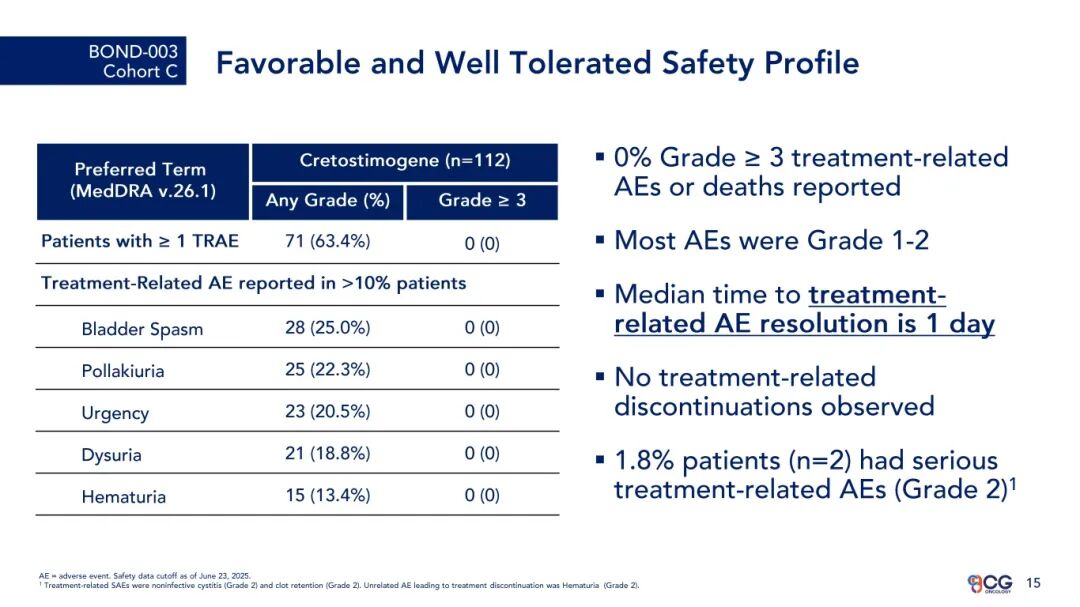 在获得优异疗效的情况下,Cretostimogene (CG0070)的安全性表现十分出色,没有3级及以上副作用,没有停药事件。
