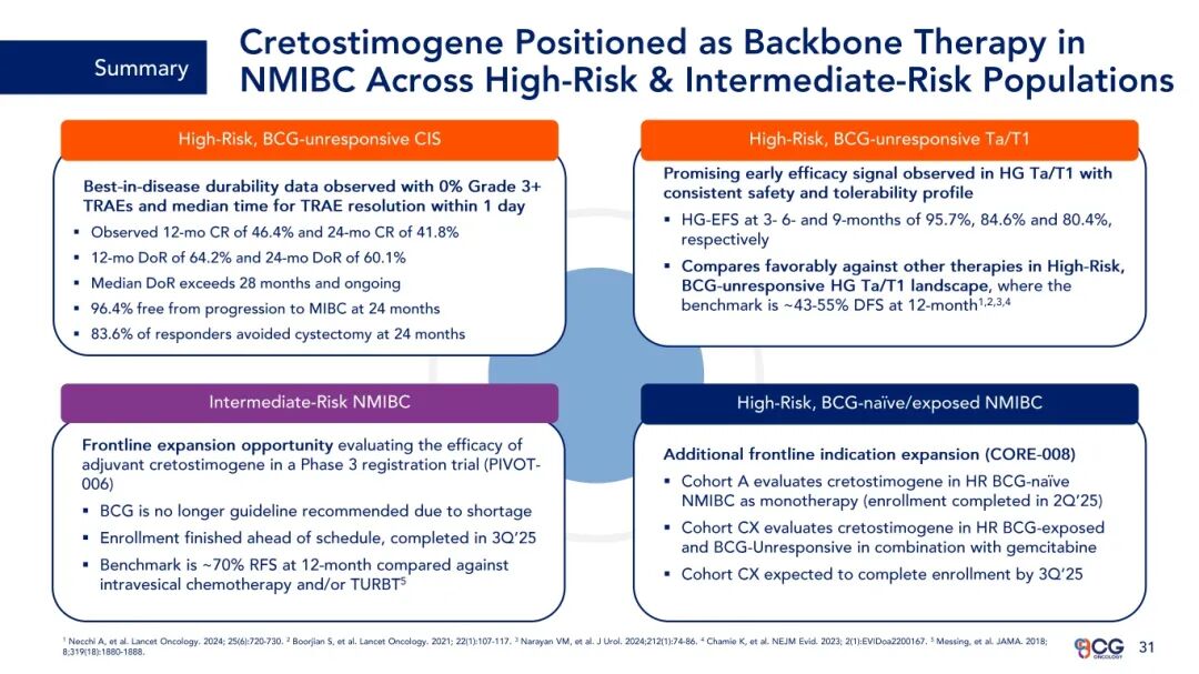 CG0070在NMIBC中高危全人群中展现出领域领先的疗效持久性与安全性,覆盖中高危各亚型人群的相关试验均取得阶段性进展,未来有望成为该领域的核心治疗方案。