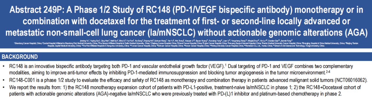 A Phase 1/2 Study of RC148 (PD-1/VEGF bispecific antibody) monotherapy or in combination with docetaxel for the treatment of first- or second-line locally advanced or metastatic non-small-cell lung cancer (la/mNSCLC) without actionable genomic alterations (AGA)