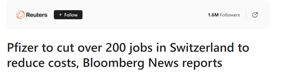 今年9月,辉瑞宣布Rea Lal接替Sabine Bruckner担任公司瑞士区负责人。仅仅两个月之后,辉瑞就在瑞士进行了裁员行动。最近两年,辉瑞一直试图重新实现增长,预计到2027年底将削减约77亿美元的成本。