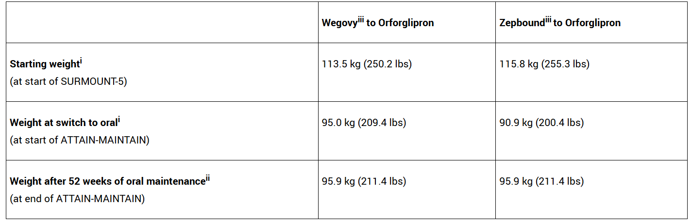 In the study, orforglipron met the primary endpoint of superior percent maintenance of body weight reduction compared to placebo, among SURMOUNT-5 participants who previously reached a body weight plateau. In pre-specified analyses at 52 weeks, participants who switched to orforglipron from Wegovy maintained their previously achieved weight loss with an average difference of 0.9 kg, while those who switched to orforglipron from Zepbound maintained their previously achieved weight loss with an average difference of 5.0 kg, using the efficacy estimand. In post-hoc analyses at 24 weeks, the last time point before placebo participants were eligible for orforglipron as rescue therapy, the change in body weight from ATTAIN-MAINTAIN baseline for patients switching to orforglipron from Wegovy was -0.1 kg vs. 9.4 kg for placebo. Likewise, for patients switching to orforglipron from Zepbound, the change from baseline was 2.6 kg vs. 9.1 kg for placebo.