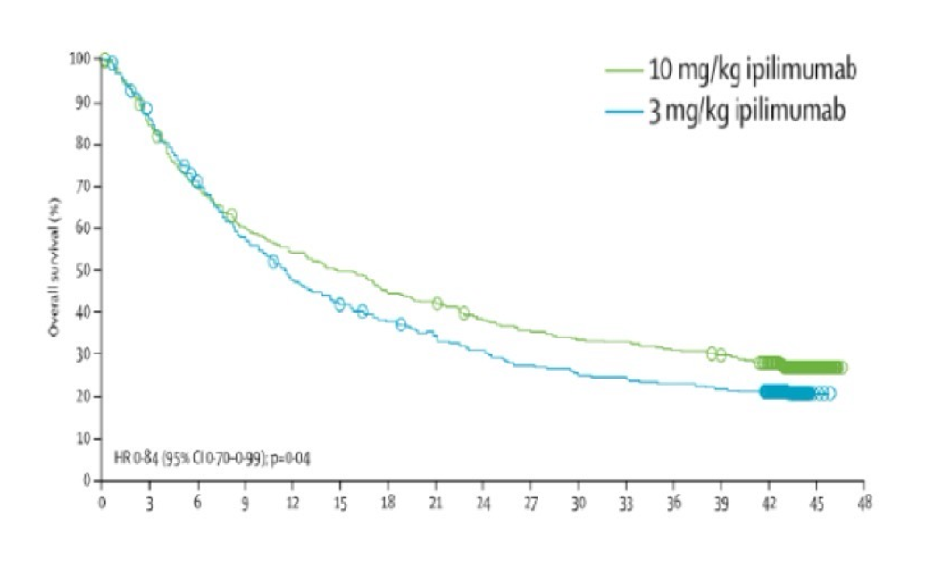 本图来源于文献:Ascierto PA et al. Ipilimumab 10 mg/kg versus ipilimumab 3 mg/kg in patients with unresectable or metastatic melanoma: a randomised, double‑blind, multicentre, phase 3 trial. Lancet Oncol. 2017 May;18(5):611–622.
