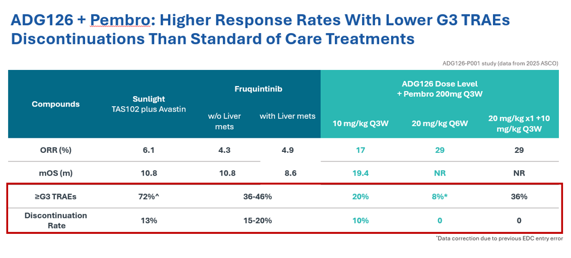 “相较之下,ADG126在MSS CRC这个更具挑战性的适应症中,患者在完全没有PD-1基础应答、原始ORR不足5%的背景下,接受20 mg/kg高剂量下的连续治疗,依然实现了近30%的ORR,经过剂量优化之后,可以让疗效与安全性同步得到提升(如20 mg/kg Q6W,≥3级TRAEs发生率低于20%)。”他进一步强调。