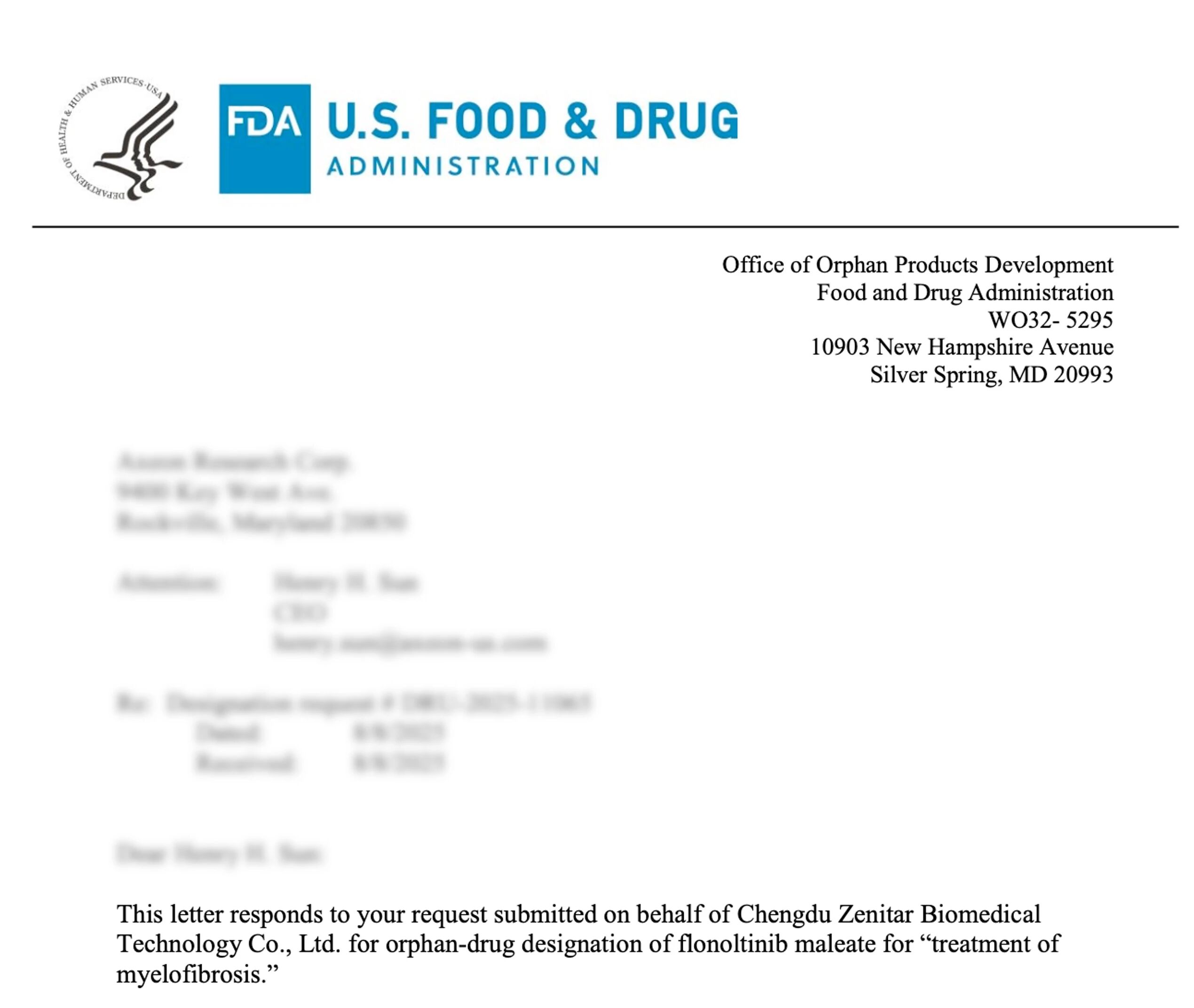 近日,美国食品药品监督管理局 (FDA) 授予赜灵生物自主研发核心产品马来酸氟诺替尼 (flonoltinib maleate, FM) 用于骨髓纤维化治疗的孤儿药资格认定。