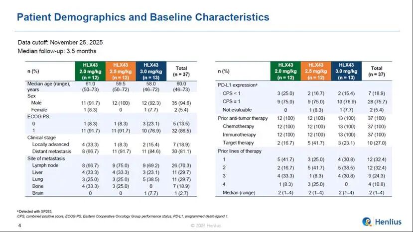 截至数据截止日期2025年11月25日,共有37名患者随机分组并接受HLX43治疗,剂量分别为2 mg/kg(n = 12)、2.5 mg/kg(n = 12)和3 mg/kg(n = 13)。大多数患者的ECOG PS评分为1(86.5%)。既往抗肿瘤治疗线数中位数为2(范围,1–4)。全部患者(100%)接受过化疗及免疫治疗,27.0%的患者接受过靶向治疗,CPS≥1患者占75.7%,中位随访时间为3.5个月。