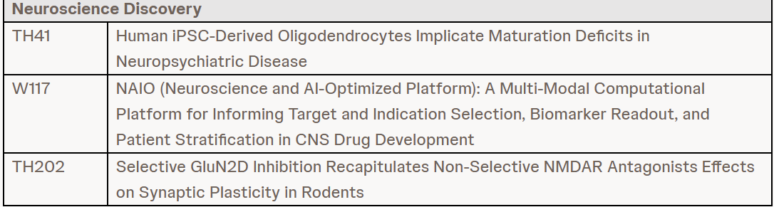 Preclinical and translational research showcasing novel AI platforms for precision medicine (Poster W117), investigating biology associated with neuropsychiatric diseases (Poster TU30), and early-stage work on new therapeutic mechanisms for depression (Poster TH202).4,5,6