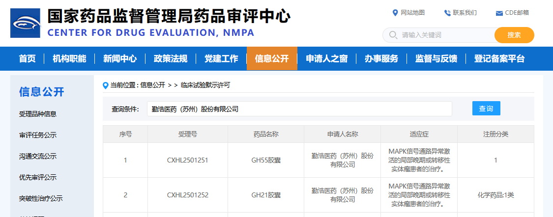2026年01月23日,中国苏州——致力于利用组合技术平台开发全球新一代抗肿瘤小分子药物的研发企业,勤浩医药今日宣布,公司申报的1类新药小分子双机制ERK1/2抑制剂GH55联合SHP2抑制剂GH21的临床试验申请已经获得中国国家药品监督管理局(NMPA)批准。该临床试验主要目的为评估MAPK信号通路异常激活的局部晚期或转移性实体瘤患者的安全性、耐受性、药代动力学及疗效。