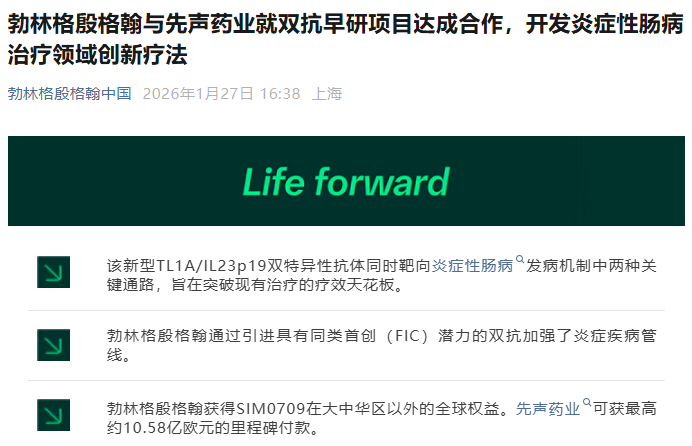 1月27日,先声药业宣布与勃林格殷格翰(BI)达成许可与合作协议,后者将获得临床前阶段药物SIM0709在大中华区以外的全球权益。