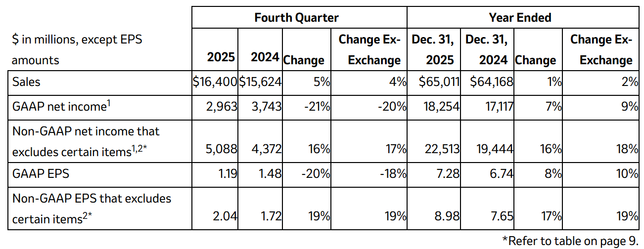 Generally Accepted Accounting Principles (GAAP) earnings per share (EPS) assuming dilution was $1.19 for the fourth quarter and $7.28 for the full year of 2025. Non-GAAP EPS was $2.04 for the fourth quarter and $8.98 for the full year of 2025. GAAP and non-GAAP EPS in the fourth quarter of 2025 include a charge of $0.05 per share related to an agreement with Dr. Falk Pharma GmbH (Falk) pursuant to which the Company secured the sole global rights to MK-8690. GAAP and non-GAAP EPS in the fourth quarter of 2024 include a charge of $0.23 per share related to the execution of licensing agreements with LaNova Medicines Ltd. (acquired by Sino Pharmaceutical Limited) and Hansoh Pharma. GAAP and non-GAAP EPS for the full years of 2025 and 2024 include charges of $0.20 and $1.28 per share, respectively, related to certain licensing agreements and asset acquisitions.