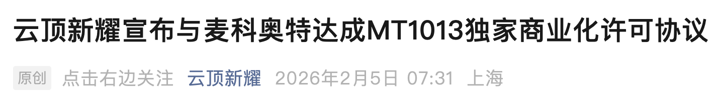 2026年2月5日,云顶新耀宣布与陕西麦科奥特医药科技股份有限公司签署独家商业化许可协议,获得其全球首创靶向CaSR/OGP受体激动剂多肽MT1013在中国及亚太区(日本除外)的独家商业化授权。