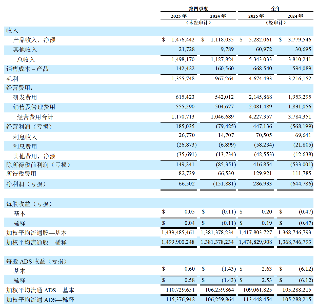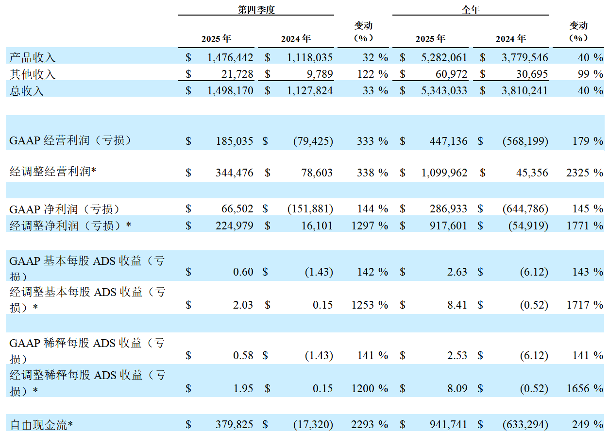 2025年第四季度,基本和稀释每股收益分别为0.05美元和0.04美元,基本和稀释每股ADS收益分别为0.60美元和0.58美元,上年同期基本每股亏损为0.11美元,基本每股ADS亏损为1.43美元。2025年全年,基本和稀释每股收益分别为0.20美元和0.19美元,基本和稀释每股ADS收益分别为2.63美元和2.53美元,上年同期基本每股亏损为0.47美元,基本每股ADS亏损为6.12美元。