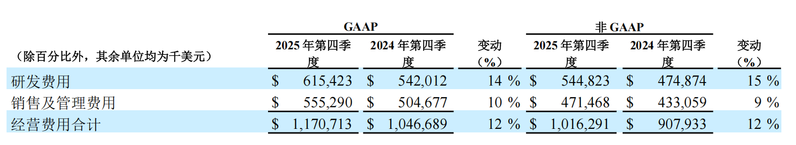 下表分别概述2025年第四季度和2024年第四季度的经营费用: