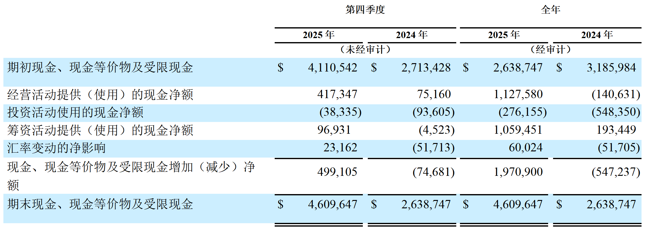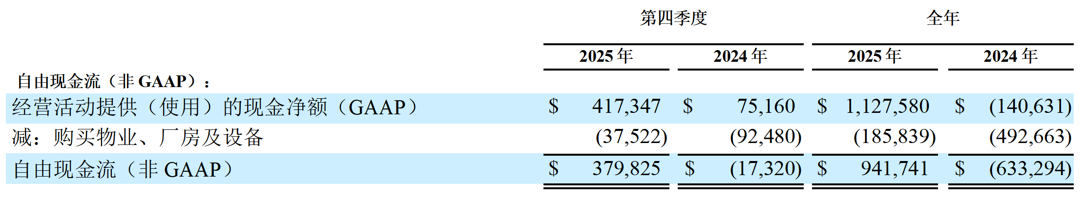 自由现金流:2025年第四季度,自由现金流为3.8亿美元,比上年同期增加3.97亿美元。2025年全年,自由现金流为9.42亿美元,比上年同期增加16亿美元。