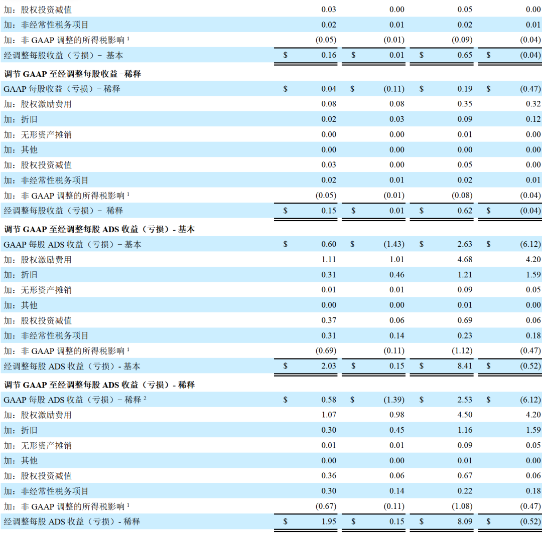 第四季度和全年,GAAP稀释每股美国存托股份(ADS)收益分别为0.58美元和2.53美元;非GAAP稀释每股ADS收益分别为1.95美元和8.09美元