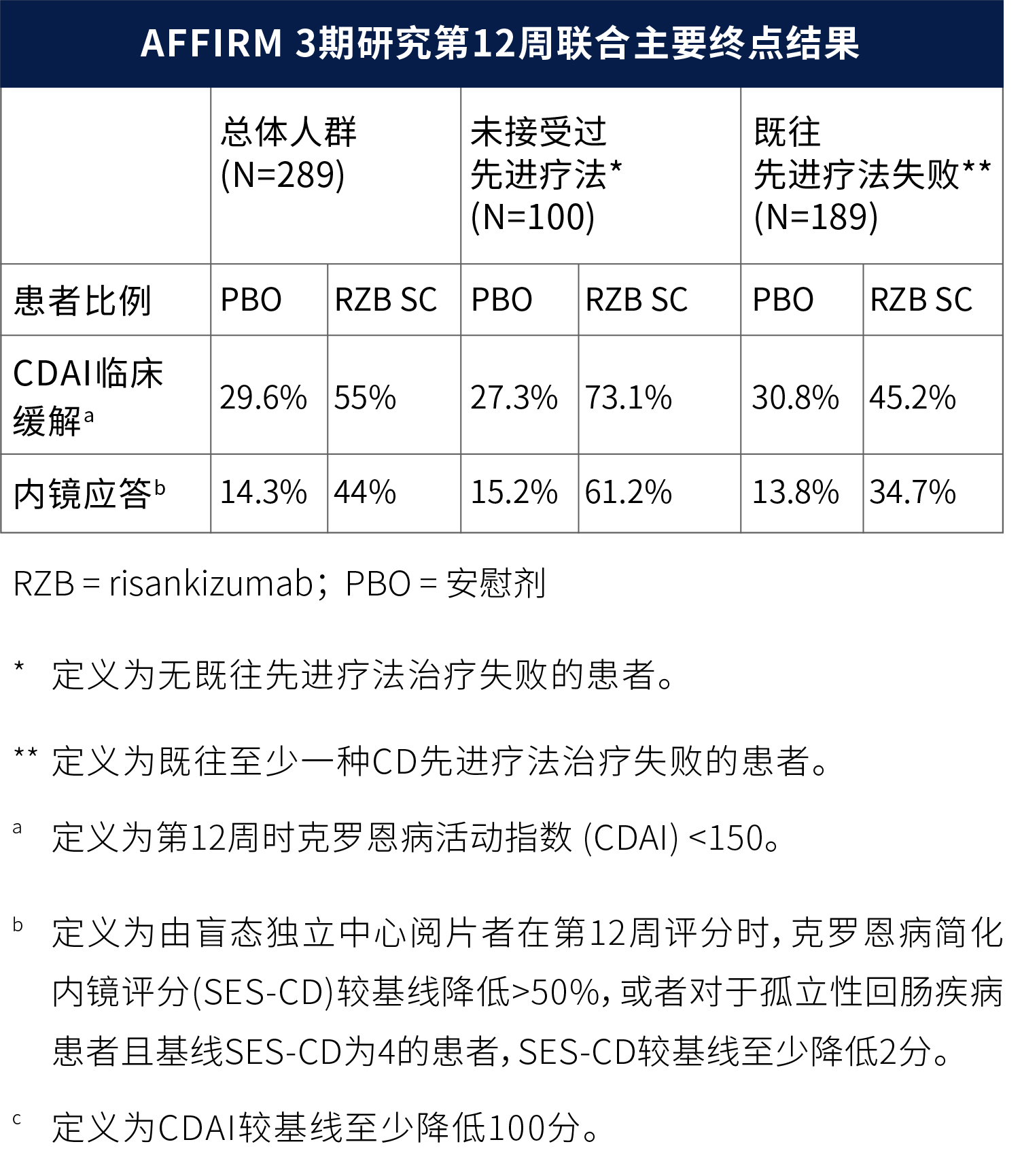 AFFIRM是一项全球、3期、随机、安慰剂对照、双盲研究,旨在评价risankizumab皮下 (SC) 给药作为中度至重度活动性克罗恩病成人患者的诱导治疗的疗效和安全性。联合主要终点为第12周时达到CDAI临床缓解 (CDAI<150) 的受试者百分比以及达到内镜应答的受试者百分比。共有289例患者以2:1的比例随机接受risankizumab皮下给药或安慰剂治疗。risankizumab皮下给药组和安慰剂组之间的关键人口统计学和基线特征大致平衡;65%的受试者既往使用CD先进疗法后治疗失败。本研究包括3个治疗阶段:安慰剂对照阶段A(基线至第12周),旨在评价risankizumab皮下诱导治疗的疗效和安全性;扩展阶段B(第12-24周),患者根据其第12周的临床应答接受盲态或开放性治疗;52周开放性扩展阶段C,所有患者均接受获批的risankizumab维持治疗。关于本试验的更多信息,请参见www.clinicaltrials.gov(NCT06063967)。