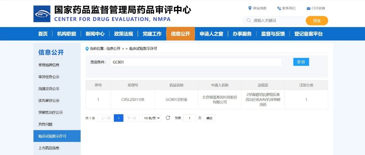2026年3月16日,北京锦篮基因科技股份有限公司(以下简称“锦篮基因”)自主研发的IgG(免疫球蛋白G)降解酶药物GC801注射液获国家药品监督管理局注册临床试验默示许可(受理号:CXSL2501108),本次申报适应症为:2型脊髓型肌萎缩症基因治疗前AAV抗体降解用药,这是锦篮基因申报的第五款1类新药,第八项注册临床试验。