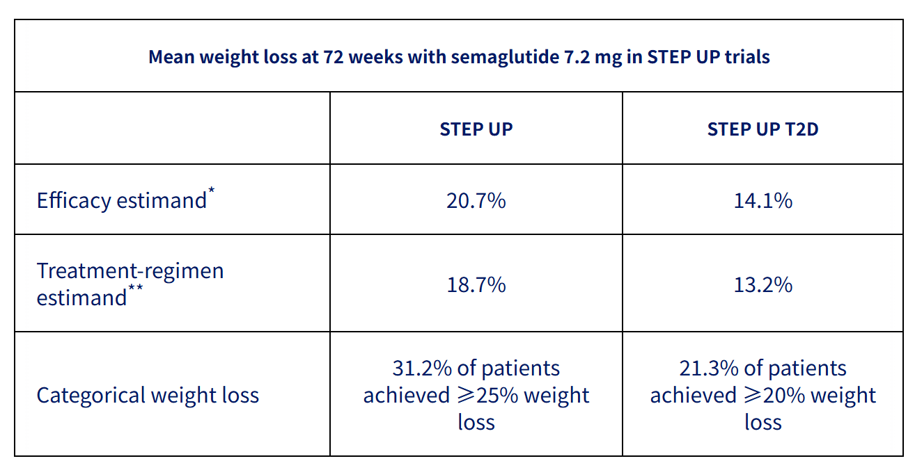 The STEP UP and STEP UP T2D phase 3 trials investigated the efficacy and safety of injectable semaglutide 7.2 mg in people with obesity with or without type 2 diabetes.