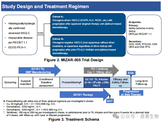 本届大会上,君赛生物将正式公布“自体天然肿瘤浸润淋巴细胞注射液(GC101)治疗晚期非小细胞肺癌(NSCLC)Ib期临床试验(MIZAR-005)”研究方案。