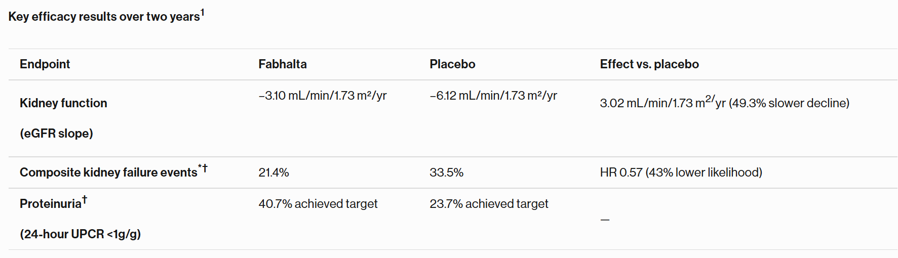 APPLAUSE-IgAN (NCT04578834) is a global, randomized, double-blind, placebo-controlled Phase III study evaluating Fabhalta in adults with biopsy-confirmed IgAN and persistent proteinuria despite optimized supportive care. Patients were randomized 1:1 to receive Fabhalta or placebo and were followed for up to 24 months11. The primary endpoint was the annualized total eGFR slope over 24 months. Key secondary endpoints included time to first composite kidney failure event and changes in proteinuria over 9 months1.